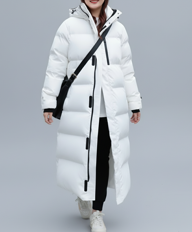 Długa damska kurtka puchowa – ciepło, komfort i minimalistyczny design