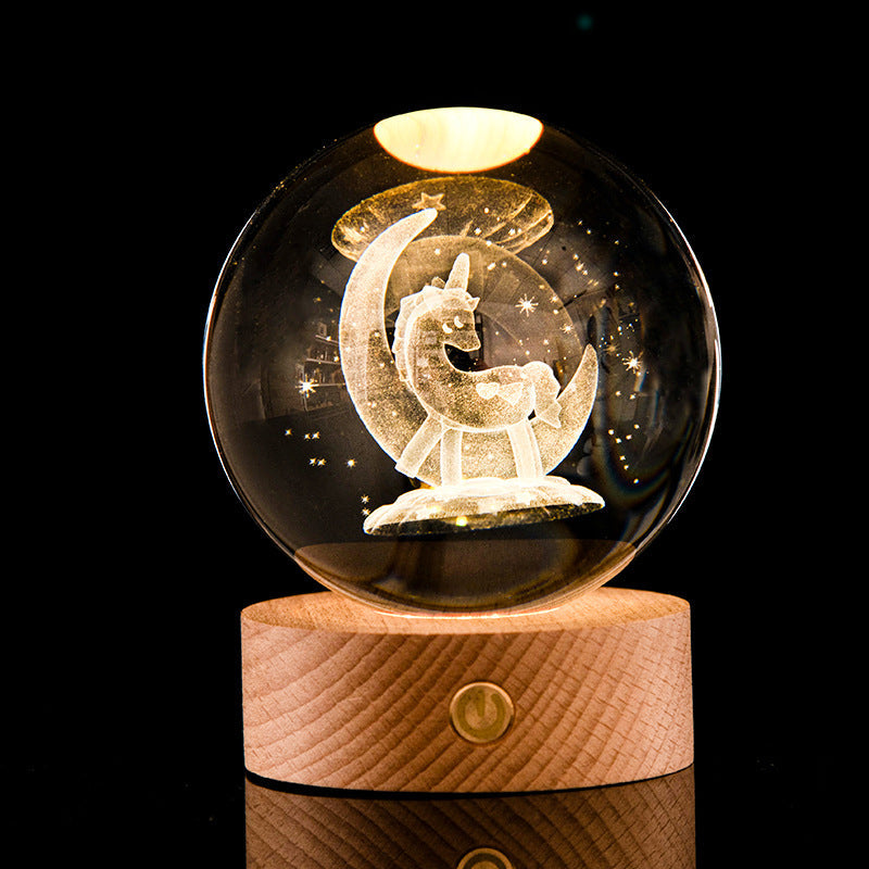 3D Kryształowa Lampa LED – Dekoracyjna Kula Świetlna z Drewnianą Podstawą