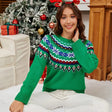 Damski sweter świąteczny – zielony sweter zimowy z kolorowym nordyckim wzorem