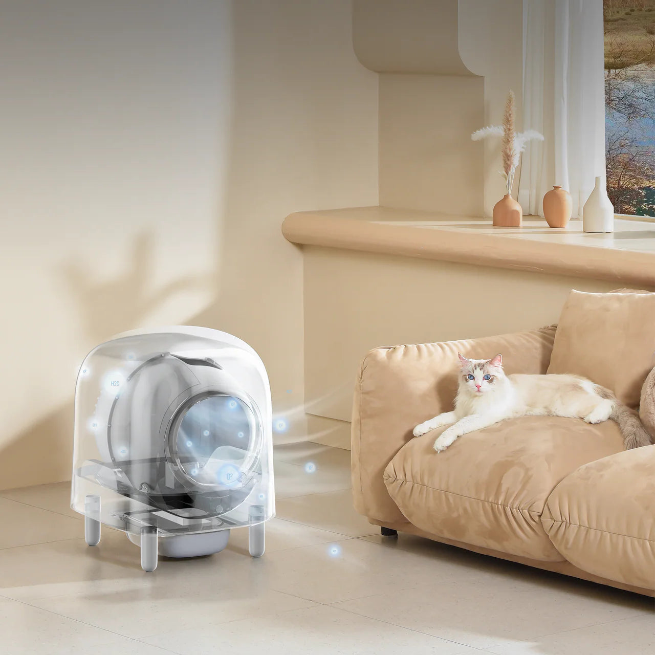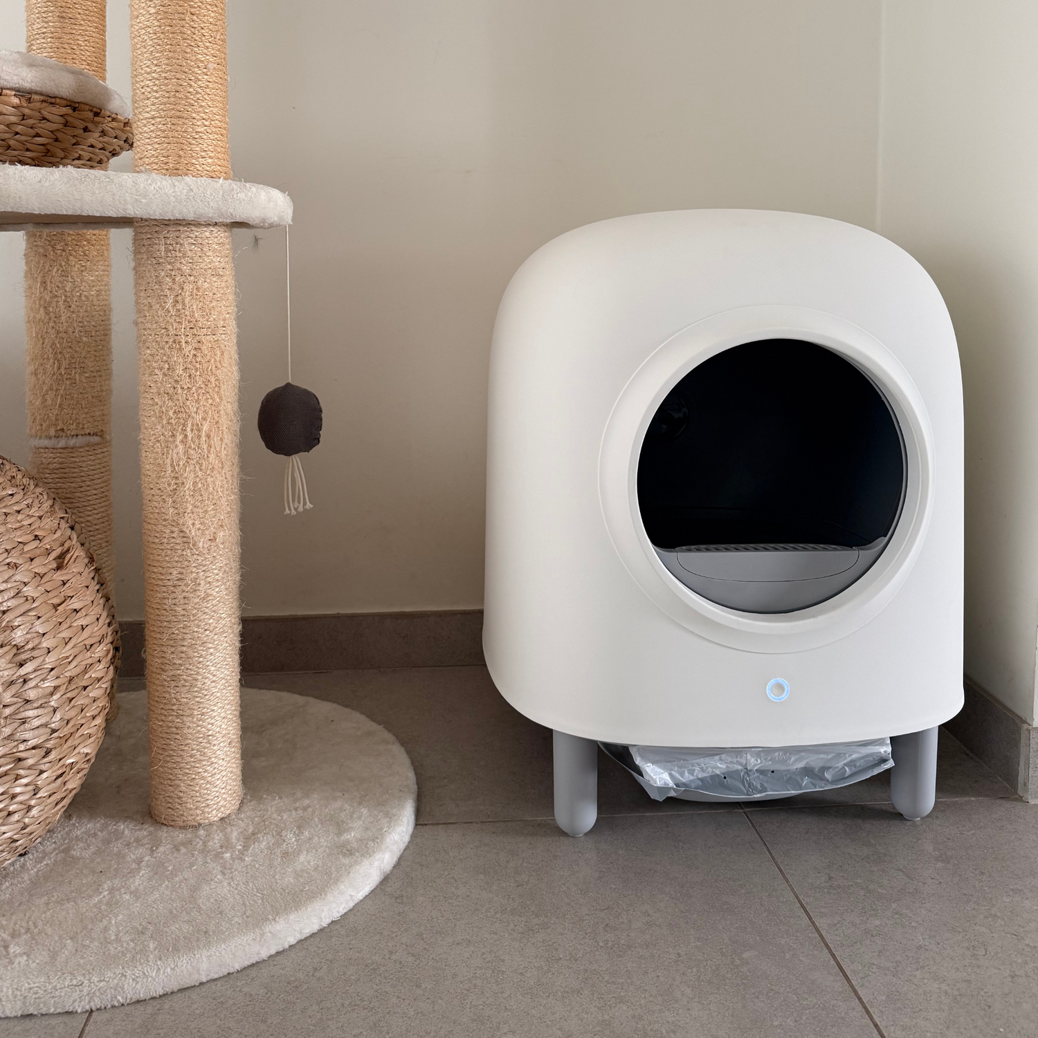 Kuweta jest łatwo dostępna dla kotów i niezwykle praktyczna dla właścicieli. Zamknięta konstrukcja zapewnia spokojny wygląd wnętrza i sprawia, że kuweta doskonale nadaje się do salonu lub innych pomieszczeń mieszkalnych.